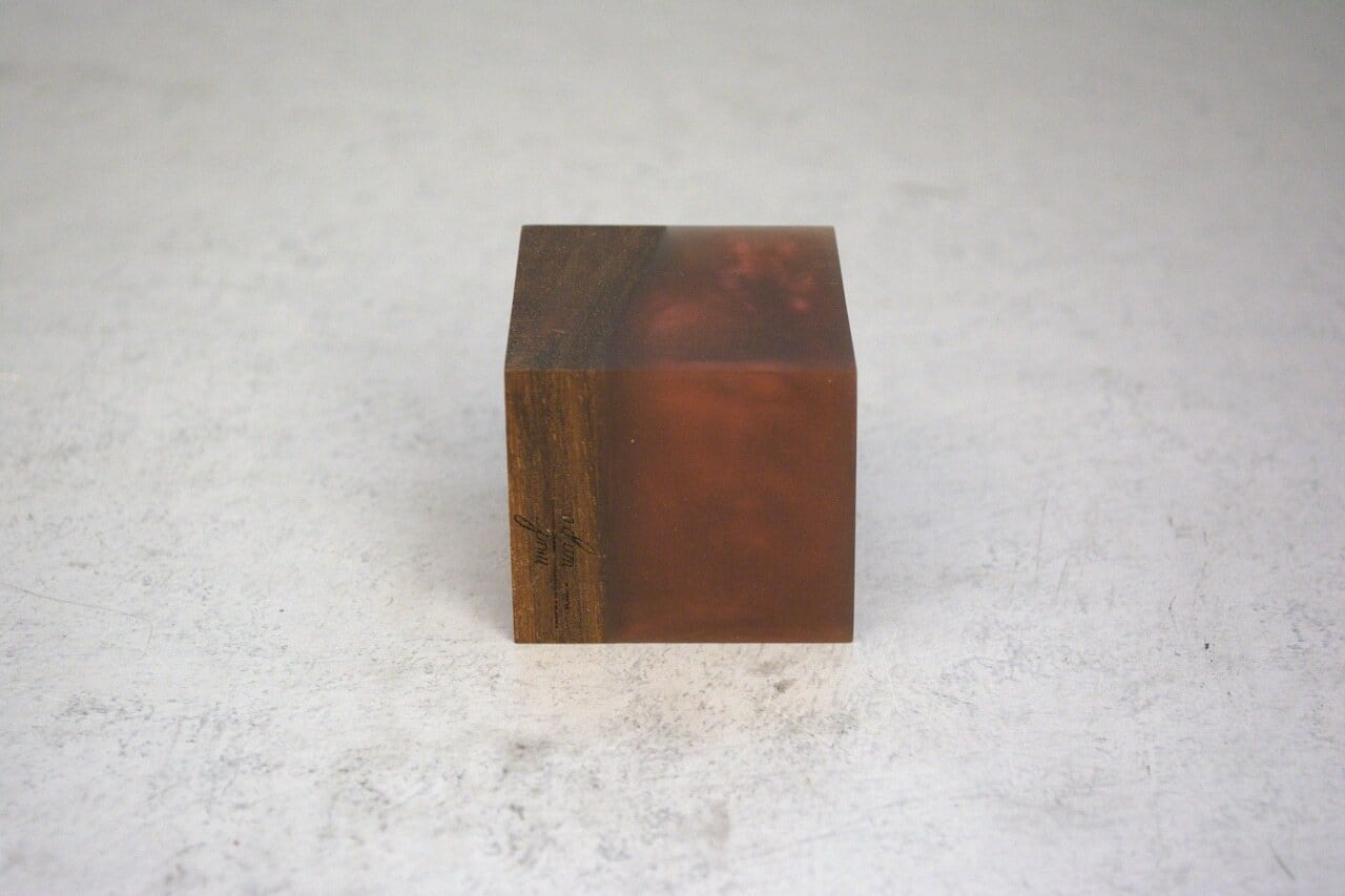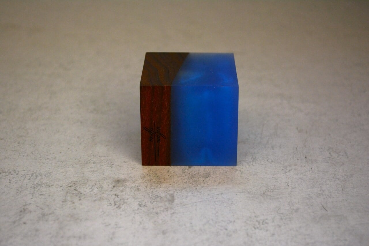 天然のウォールナットと色付けしたレジンで製作しました。