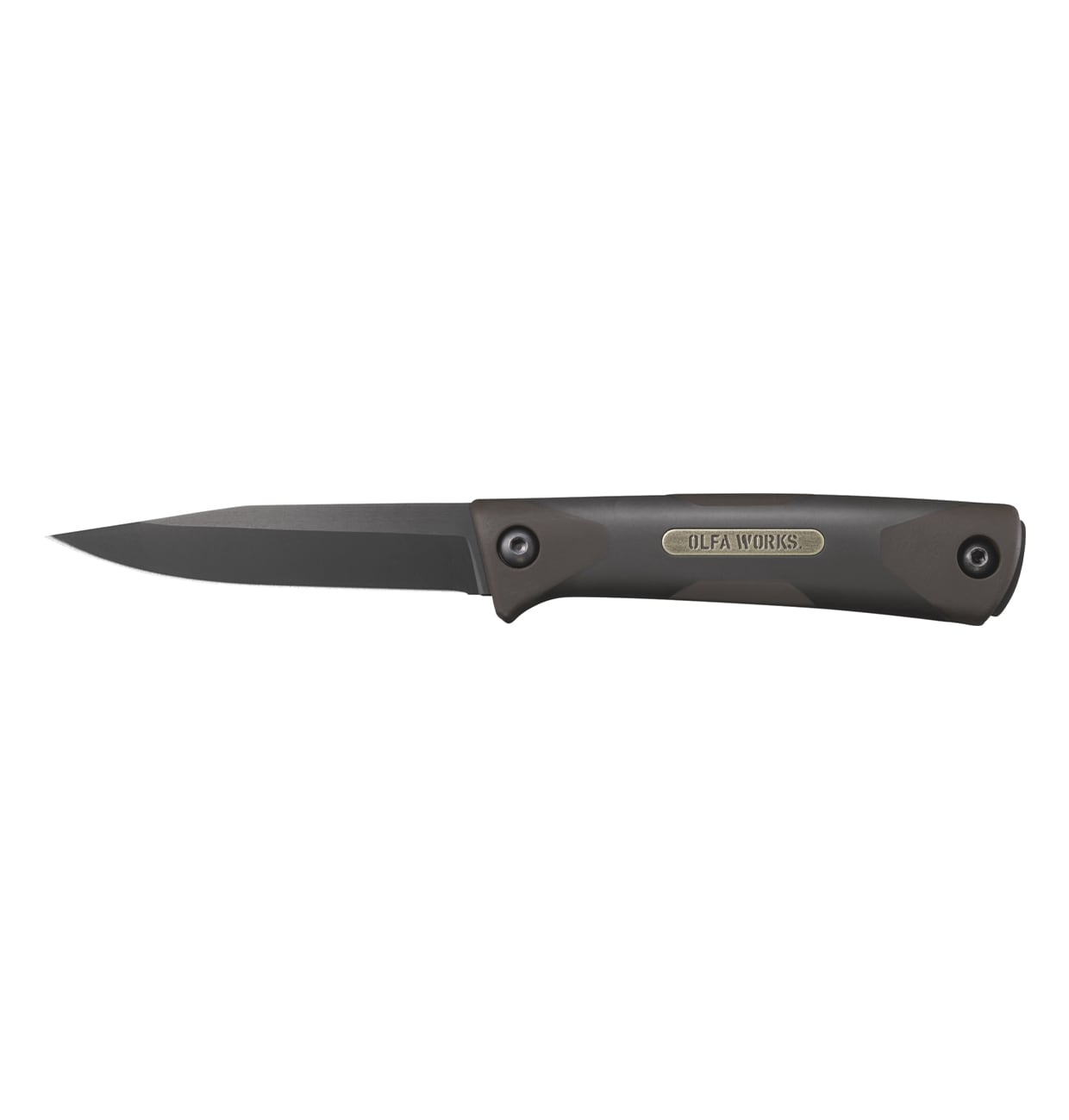 3.2mm 厚のステンレス刃を装着したフルタングナイフ。切る・削るはもちろん、バトニングも可能。職人が1 本1 本丁寧に研ぎあげた刃とオルファの知識・経験をいかした設計は、切れ味・耐久性・使いやすさに優れています。シース付き。刃とグリップはアウトドアショップ「Orange」監修の特別仕様。