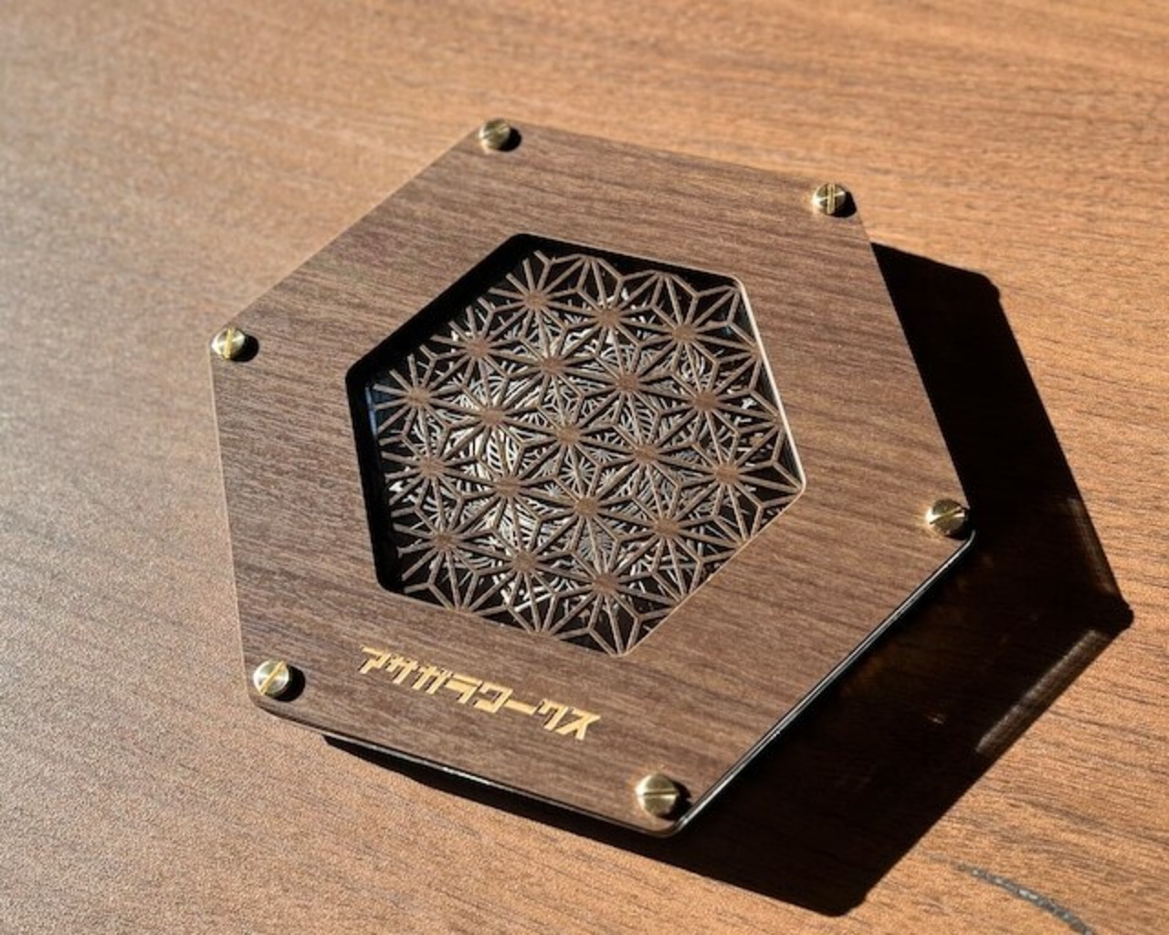 ・レーザー加工機でカットした模様は組子細工の麻の葉のパターンで平安時代に仏教の尊像の衣服にも用いられており、